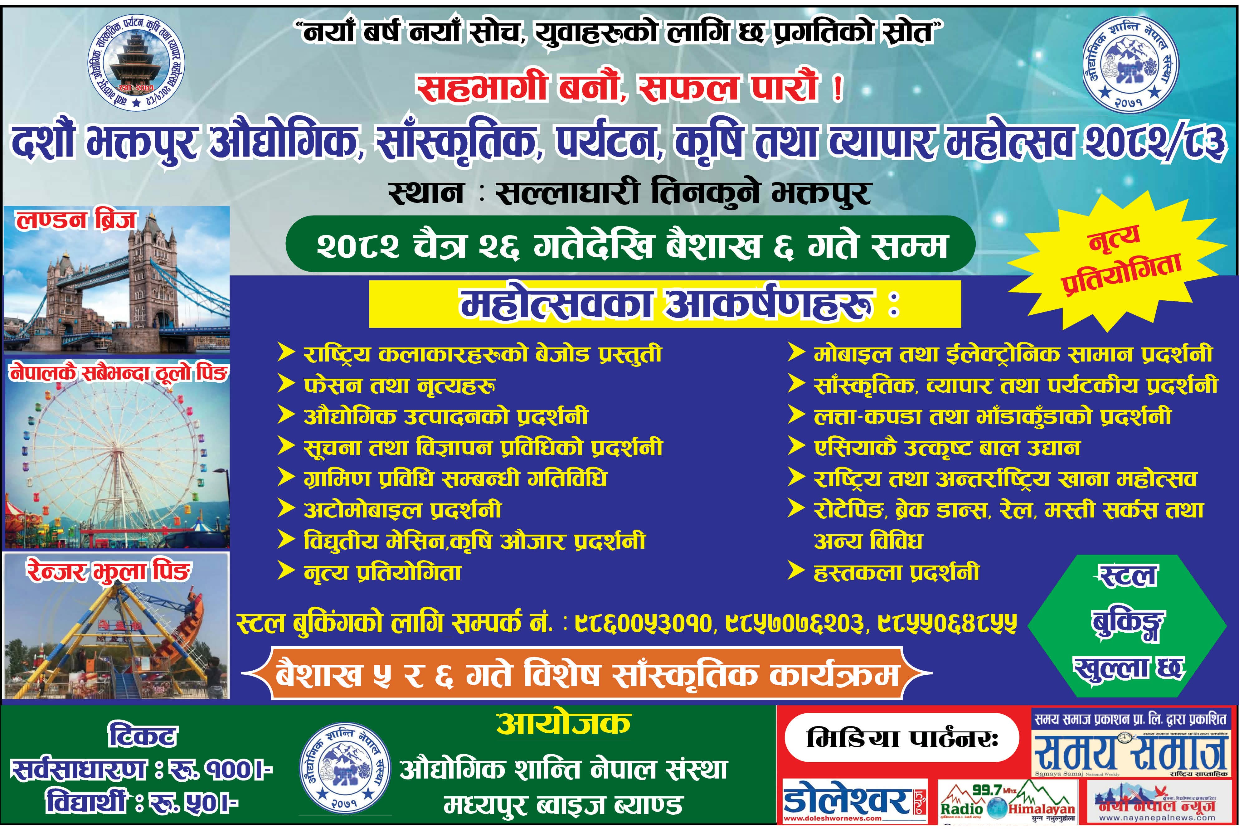 भक्तपुरको सल्लाघारी चौरमा यहीँ चैत २६ गतेबाट दशौं ‘भक्तपुर औद्योगिक, सांस्कृतिक, पर्यटन, कृषि तथा व्यापार महोत्सव शुरू हुन गइरहेको छ ।